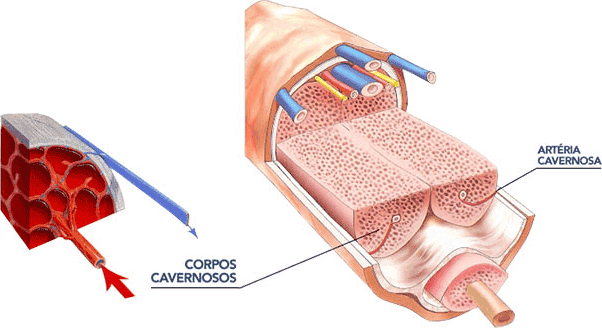 Dentro do pênis, existem os corpos cavernosos, que são como câmaras que se enchem de sangue. Quando essas câmara estão totalmente cheias de sangue, elas incham e acontece a ereção.